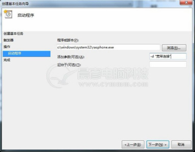 4,在[程序或脚本]栏输入 c:\windows\system32\rasphone.exe 在[添加参数]栏输入 -d "宽带连接" 再点[下一步],如下图: